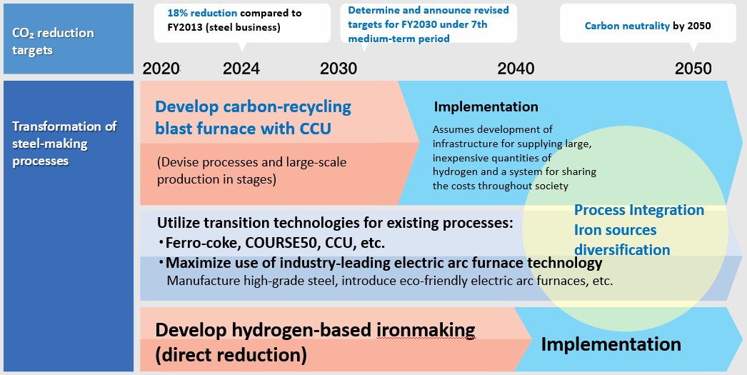 Based on the expectation that steel will remain a vital material in the carbon-neutral world of the future, JFE Steel intends to develop decarbonization technology as early as possible, ahead of other global competitors, while also enhancing existing processes with various transitional technologies, as indicated in the company’s Roadmap to Carbon Neutrality by 2050: